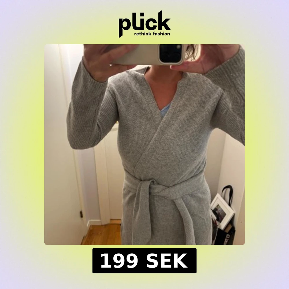 Mysig grå stickad omlottkofta med knytband i midjan och långa ärmar. Perfekt för dig som gillar en avslappnad men ändå stilren look. Koftan har en v-ringad hals och är ribbstickad för extra struktur.