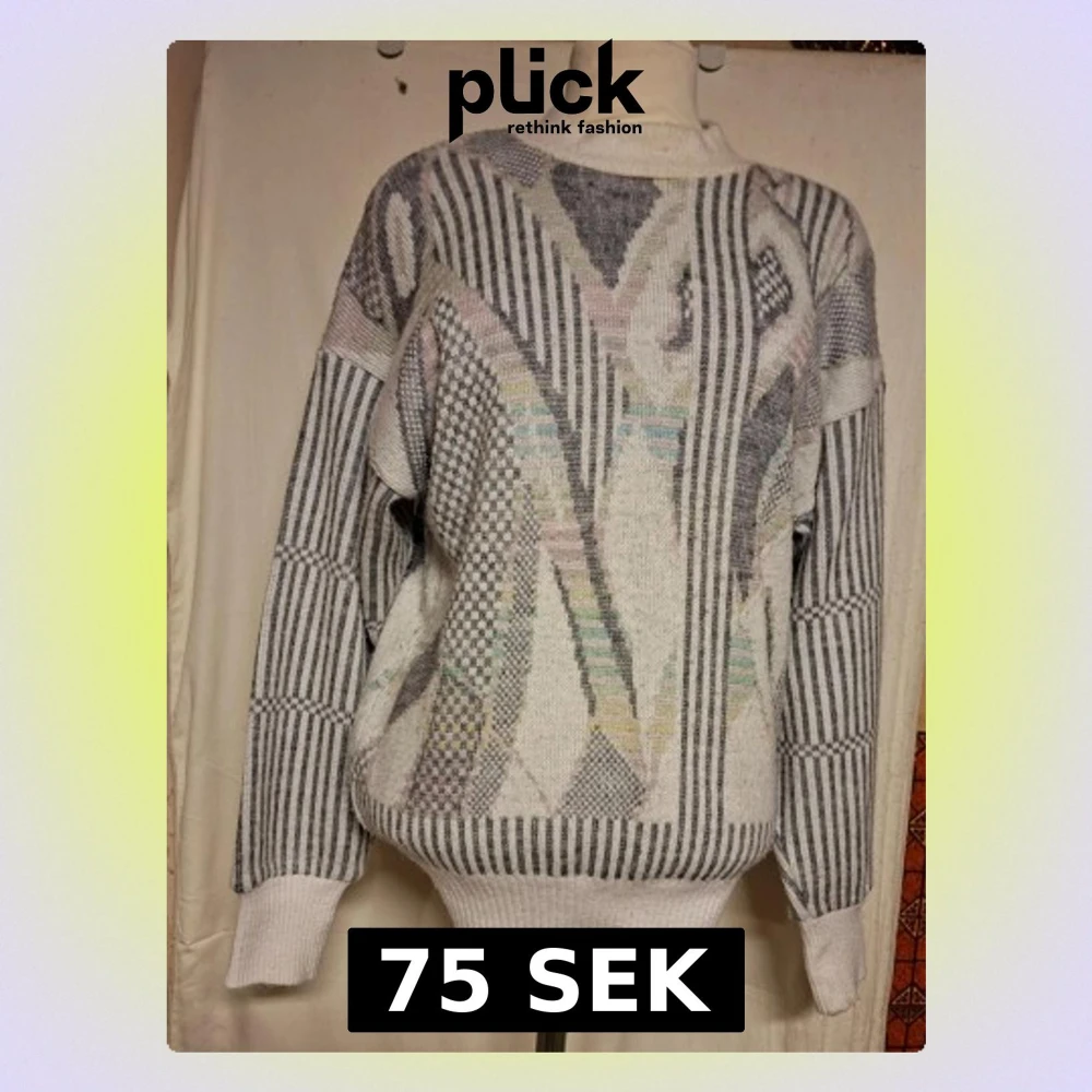Unik stickad tröja från 18 Carat med coolt grafiskt mönster i grått, vitt och pastellfärger. Tröjan har långärmade ribbade muddar och rund hals. Mönstret är en mix av ränder och geometriska former som ger en retro vibe. Perfekt för dig som gillar statement-plagg.