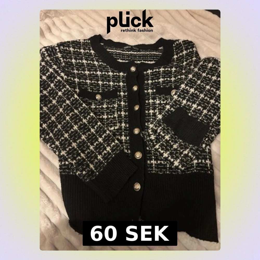 Snygg svartvit rutig kofta från SHEIN med guldfärgade knappar framtill och på fickorna. Koftan har rund hals, långa ärmar och breda ribbade muddar vid ärmslut och nederkant. Materialet är stickat och ger en mjuk och skön känsla. Denna tröjan kommer ej till användning då jag helt änkelt glömde bort den och sen slutade använda.