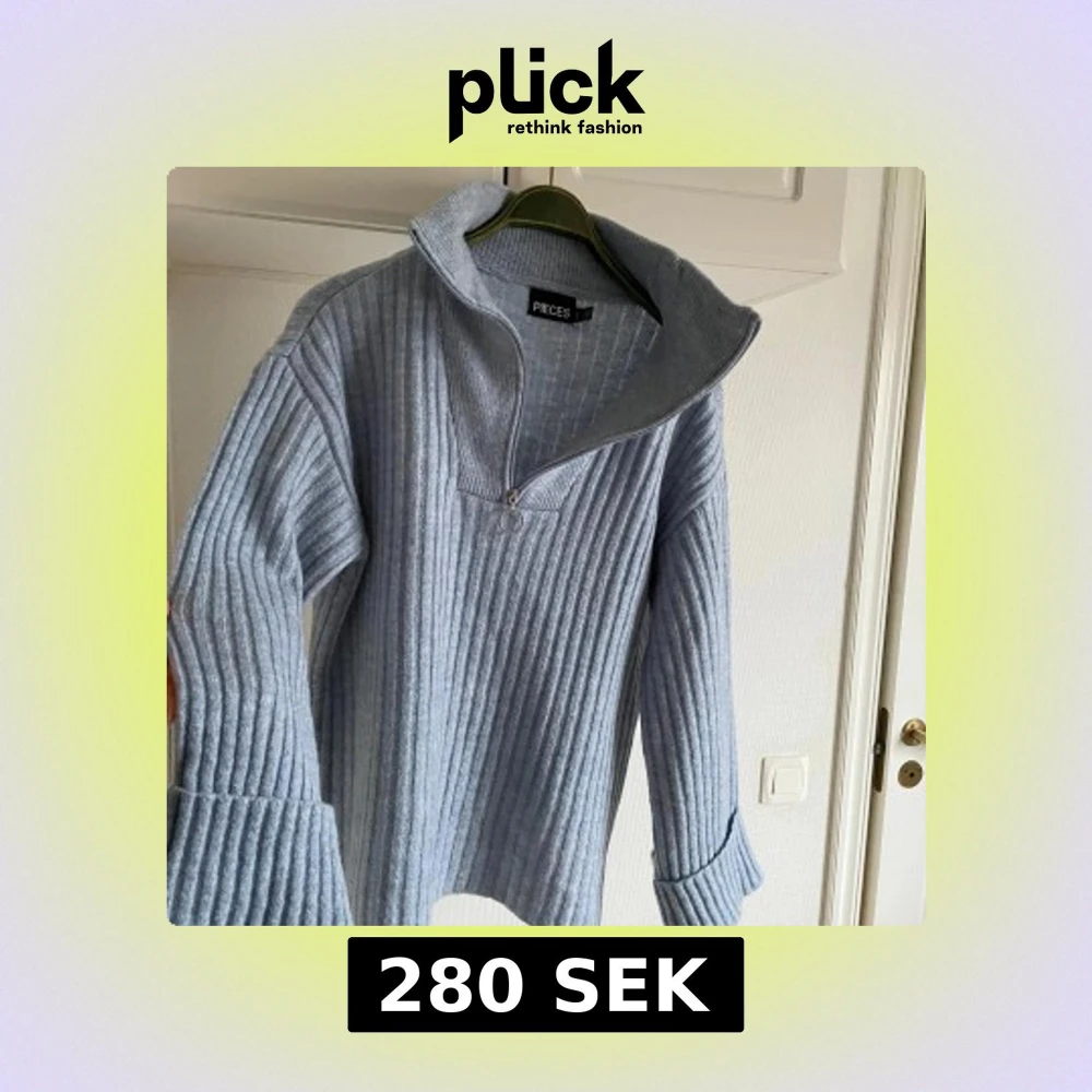 Säljer en ljusblå ribbad tröja från Pieces med dragkedja vid halsen. Tröjan har långa ärmar och en hög krage som ger en mysig känsla. Perfekt för kyligare dagar!