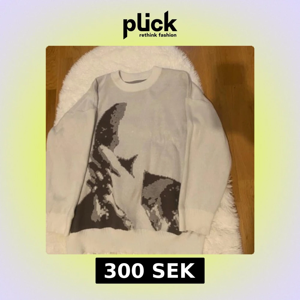 Säljer en vit stickad tröja med ett stort grafiskt mönster i svart, grått och mörkbrunt på framsidan. Tröjan har rund halsringning och långa ärmar. Perfekt för dig som gillar unika plagg med cool design.