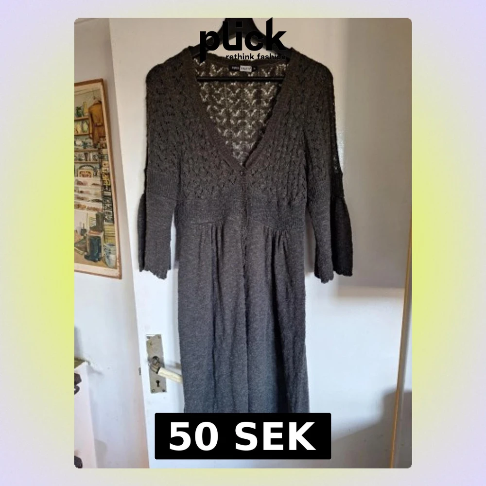 Mysig grå stickad kofts med v-ringning och knappar framtill. Klänningen har trekvartsärm och ett fint hålmönster upptill. Perfekt för lager på lager och passar till många olika stilar. Djur finns i hemmet
