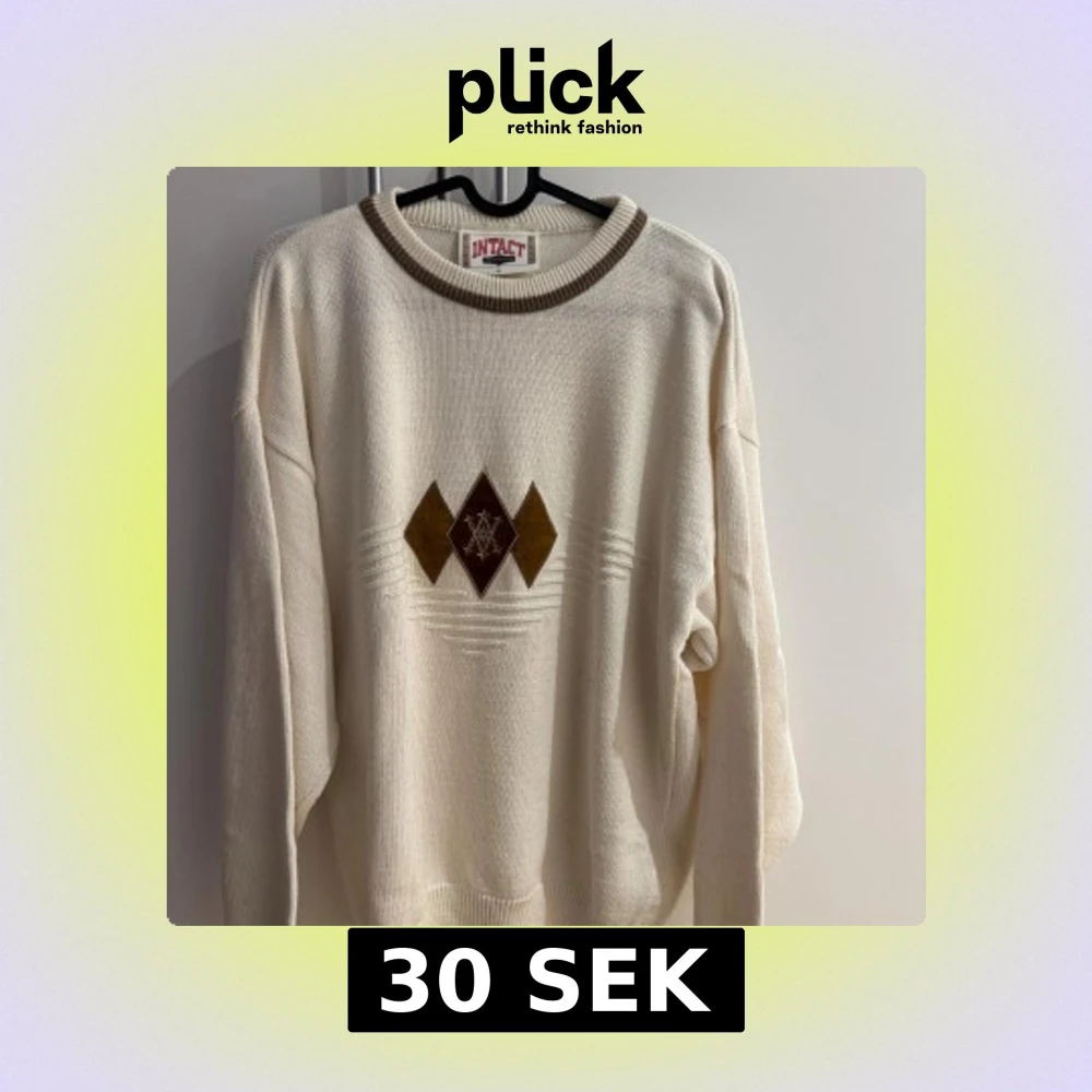 Vit stickad tröja från Intact med bruna och beige diamantmönster framtill. Tröjan har ribbade muddar och en kontrasterande brun kant vid halsen. Oversized passform och långärmad, perfekt för lager-på-lager-stil.