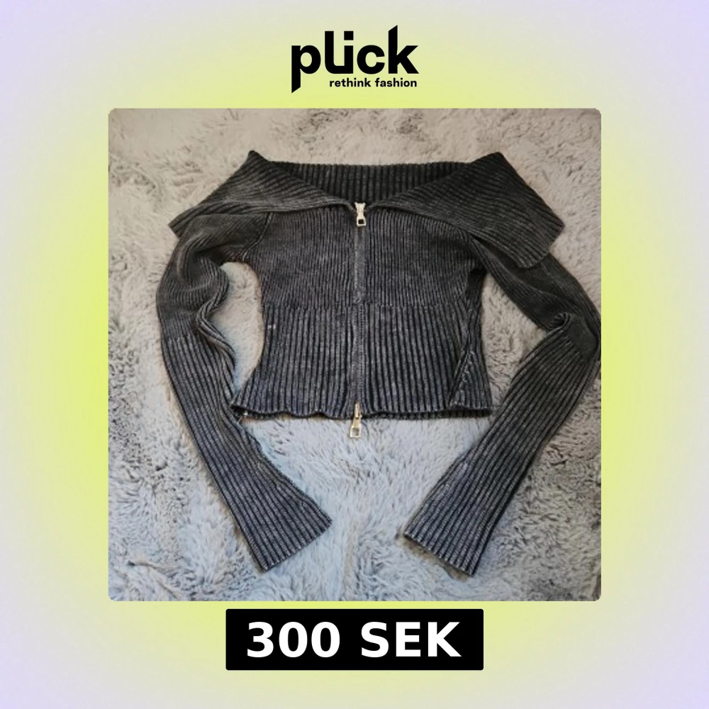 Snygg mörkgrå ribbad kofta med offshoulder-design och långärmade ärmar. Tröjan har en dragkedja framtill och är croppad i modellen, vilket ger en trendig look. Perfekt för dig som gillar stickade detaljer och vill ha något som sticker ut.