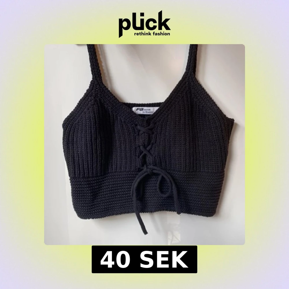 Svart stickad topp från FB Sister med smala axelband och snörning framtill. Toppen är croppad och har ribbad struktur upptill och bredare stickning nedtill. Meddela gärna för mått eller andra frågor☺️