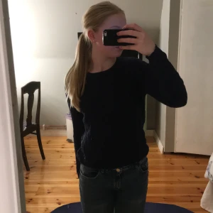 Mörkblå stickad hoodie  - Mysig svart stickad hoodie med luva och långa ärmar. Köptes förra året men använd ca 3 gpnher. Hör av er för frågor❣️
