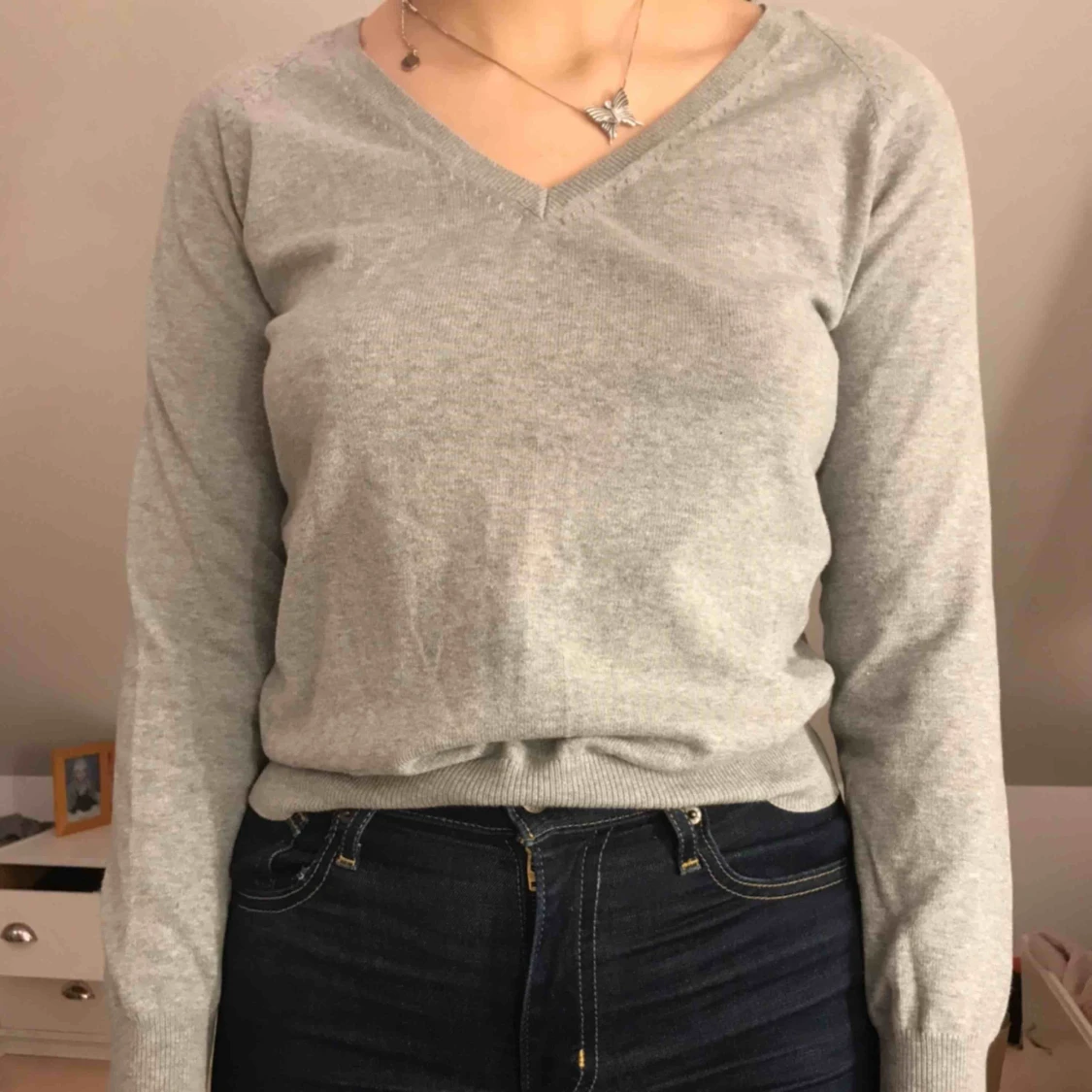 Grå stickad tröja - Snygg grå stickad tröja med vit logotyptext framtill. Den utger sig vara storlek S men är M - L. Materialet är mjukt och ger en skön känsla. Hör av dig vid intresse, pris kan diskuteras!