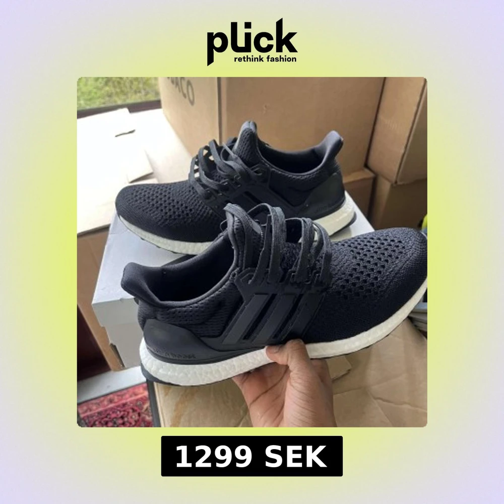 Säljer ett par svarta Adidas Ultraboost sneakers med vit Boost-sula. Skorna har stickad ovandel, klassisk snörning och tre svarta ränder på sidan. Perfekta för både träning och vardag, riktigt sköna och stilrena.