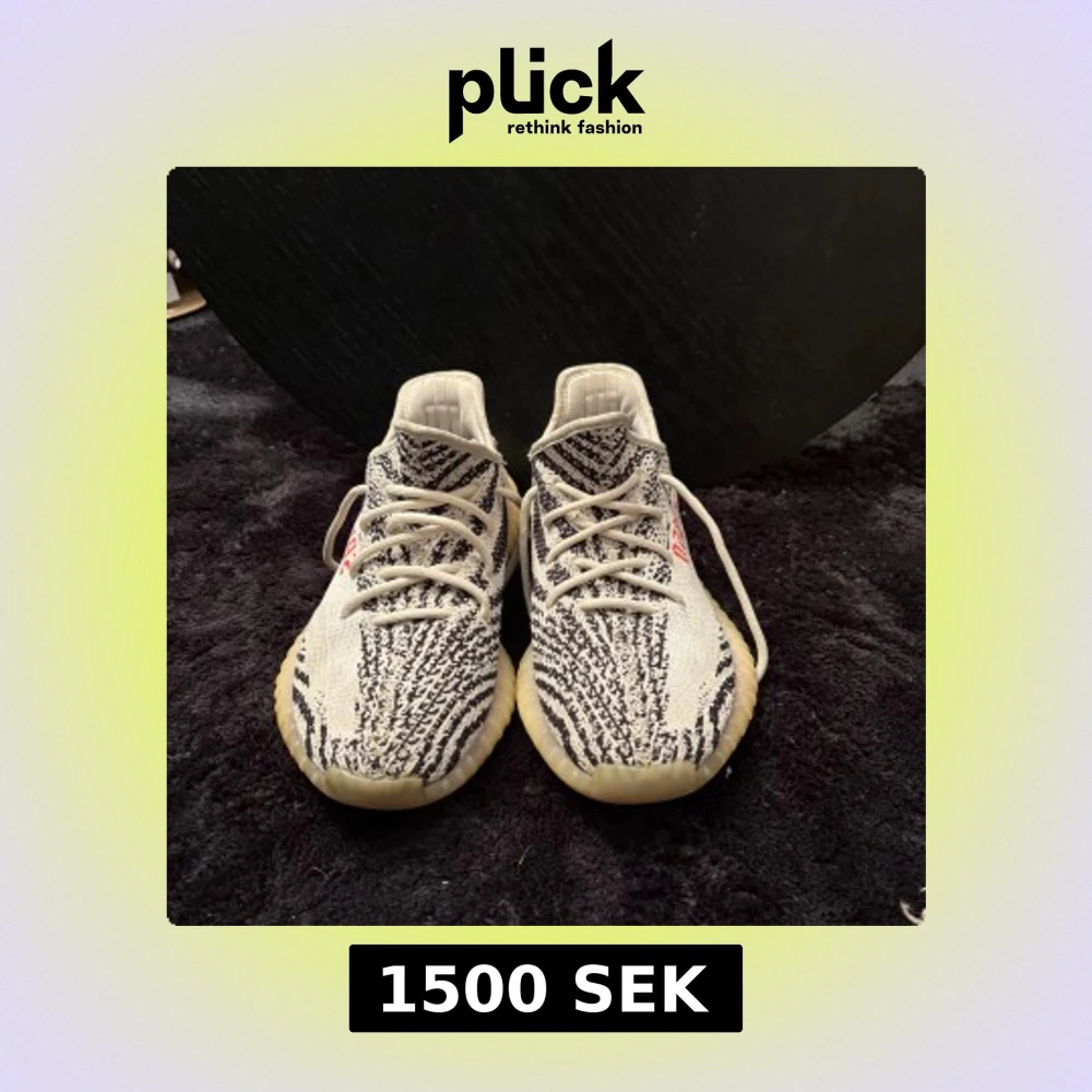 Säljer ett par Adidas Yeezy Boost 350 'Zebra' med svartvitt zebramönster, röda SPLY-350 detaljer på sidan och en krämfärgad gummisula. Skorna har snörning och är tillverkade i stickad syntet med boost-dämpning för extra komfort.