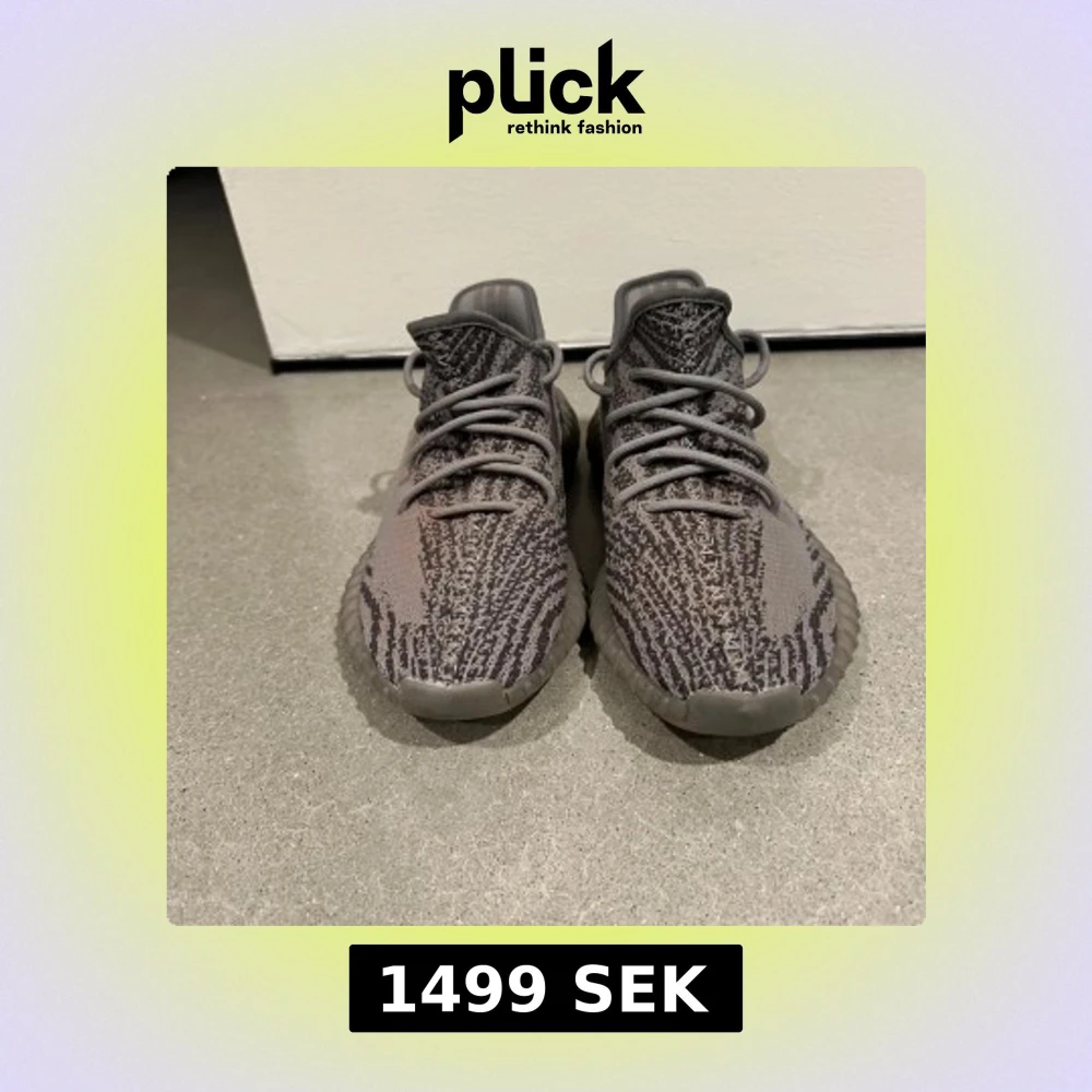 Säljer ett par Adidas Yeezy Boost 350 V2 Beluga med grå och mörkgrå stickad ovandel, orange SPLY-350-tryck på sidan och en chunky, genomskinlig sula. Skorna har snörning och en unik mönstrad design som sticker ut.