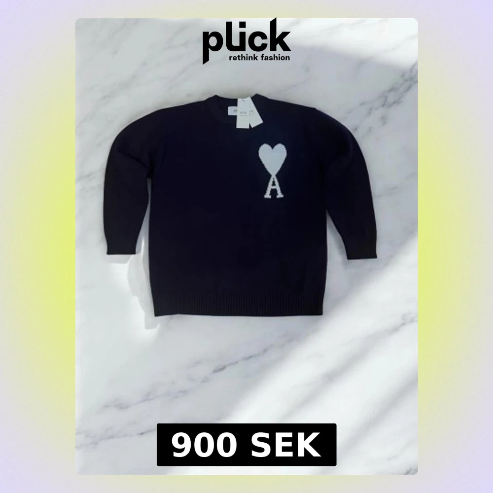 Snygg mörkblå stickad tröja från Ami med ett stort vitt hjärta och bokstaven A på bröstet. Tröjan har rund hals, ribbade muddar och lång ärm. Perfekt för dig som gillar stilrena detaljer och vill ha något som sticker ut lite extra.