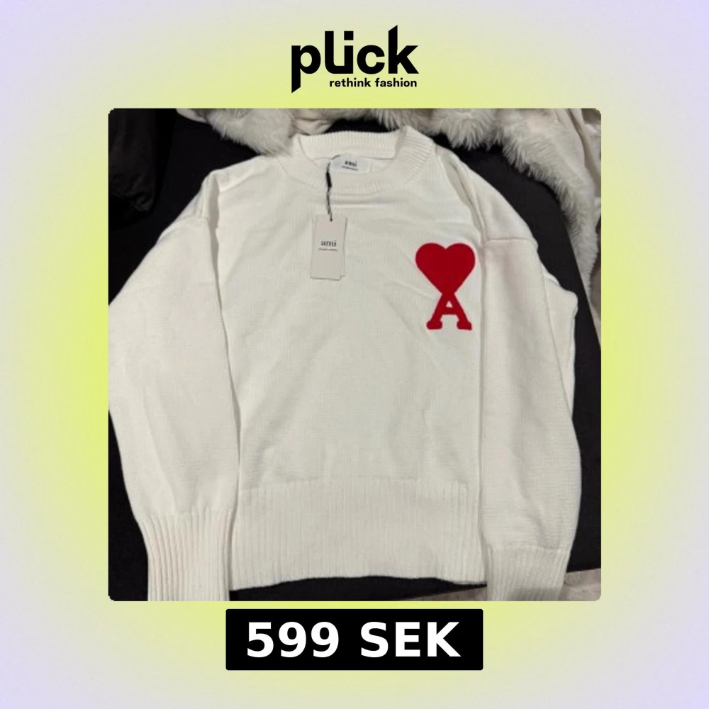 Vit stickad tröja från Ami - Säljer en vit stickad tröja från Ami med rött hjärta och bokstaven A broderat på bröstet. Tröjan har rund hals, ribbade muddar och är långärmad. Perfekt för dig som gillar stilrena detaljer och vill ha något mjukt och skönt.