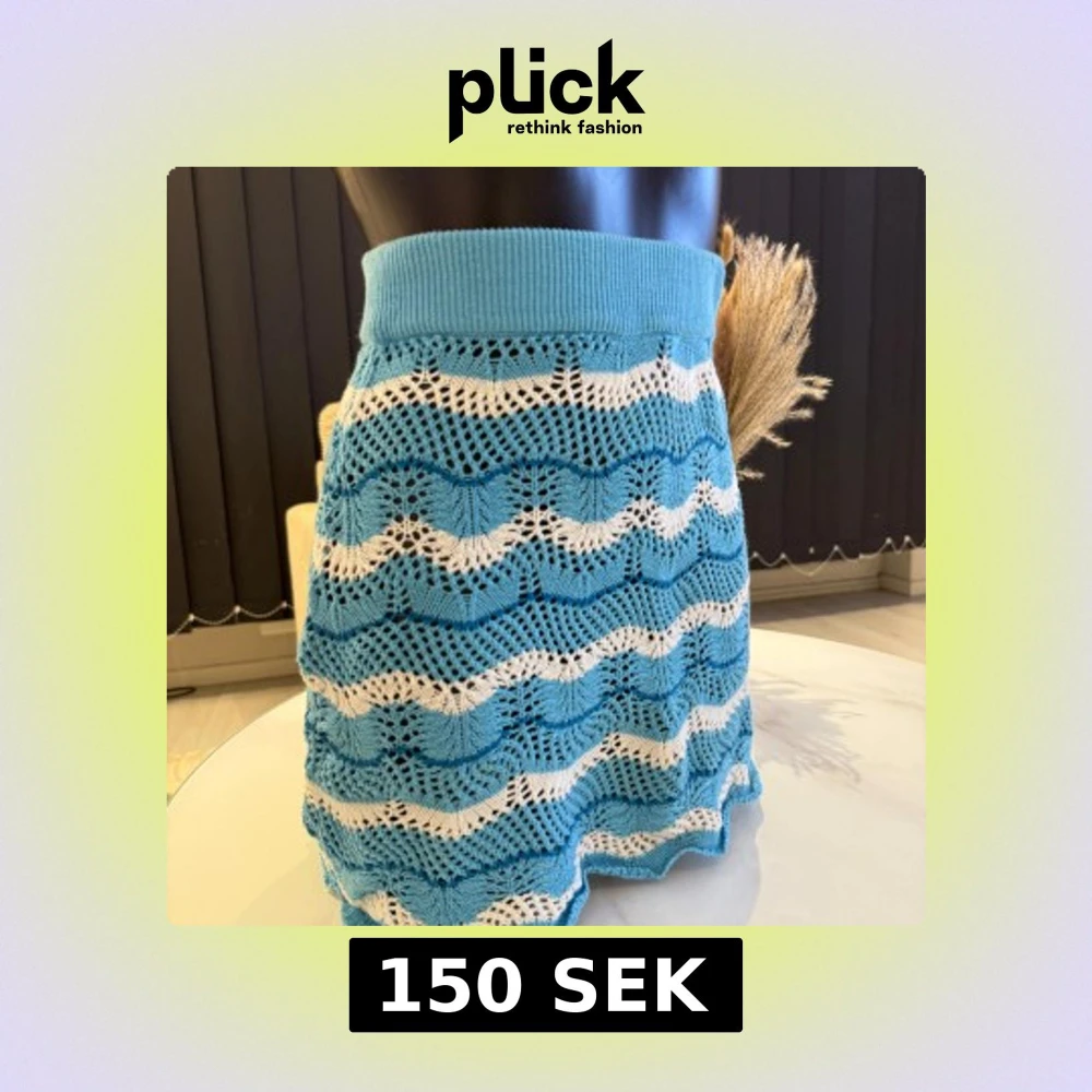 Säljer en söt blå och vit stickad kjol med vågigt mönster. Kjolen har en elastisk midja och är perfekt för en avslappnad stil. Den är kort och har en luftig design som passar bra till varmare dagar. Passar perfekt i /L storlek.🌸🌸