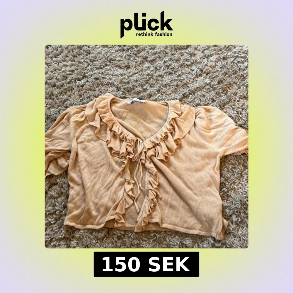 Supersöt beige stickad kofta från Zara med volangkant längs ringningen och framtill. Toppen har korta puffärmar och knytning framtill. Man kan både ha med och utan linne under. Perfekt till allt.