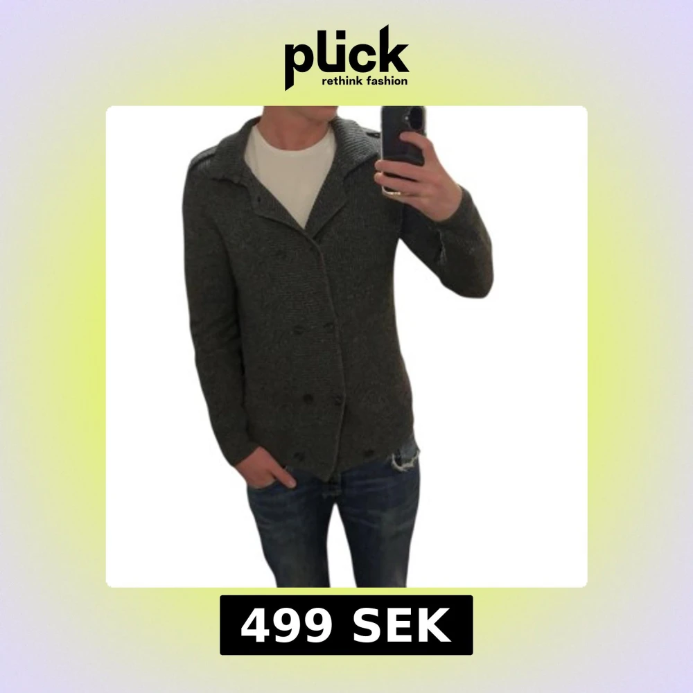 Snygg mörkgrå stickad kofta med bred krage och dubbelknäppning framtill. Koftan har långärmade ärmar och en grovstickad struktur som ger en cool och avslappnad vibe. Perfekt att slänga över en t-shirt för en enkel men stilren look.