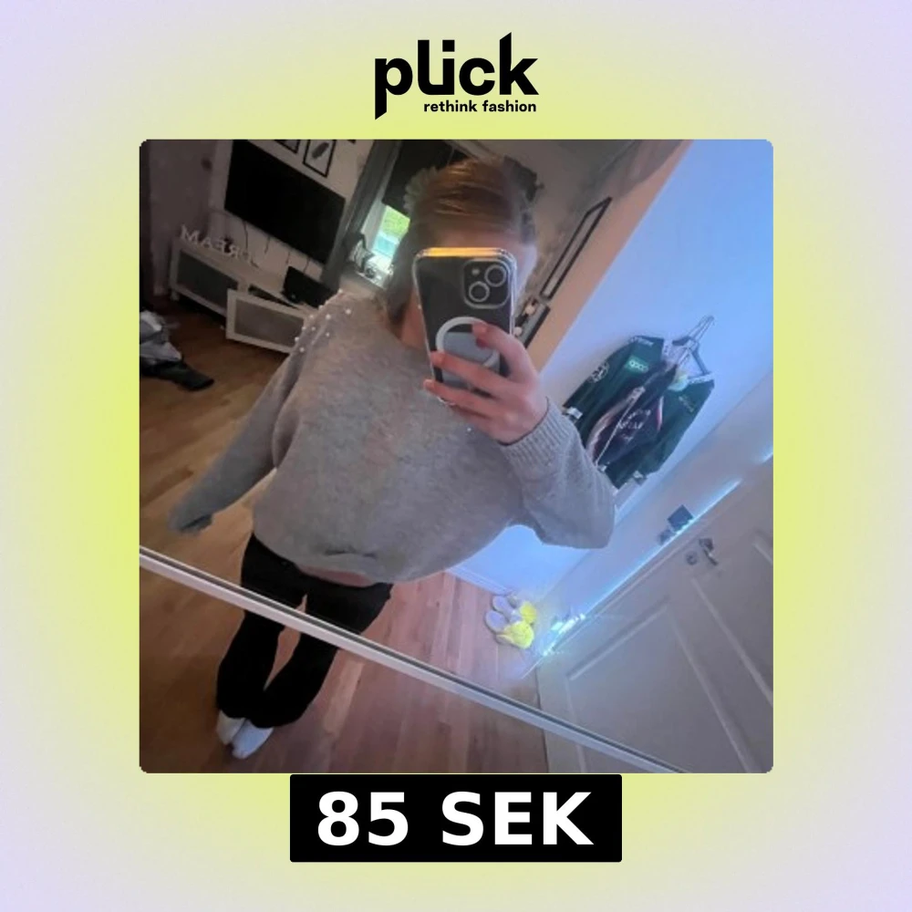 Säljer en ljusgrå stickad tröja från H&M med rund hals och ribbade muddar. Tröjan har snygga pärldetaljer på axlarna som ger en extra touch. Perfekt för dig som gillar enkel stil med lite extra. Passar dig som vill ha en normal passform.