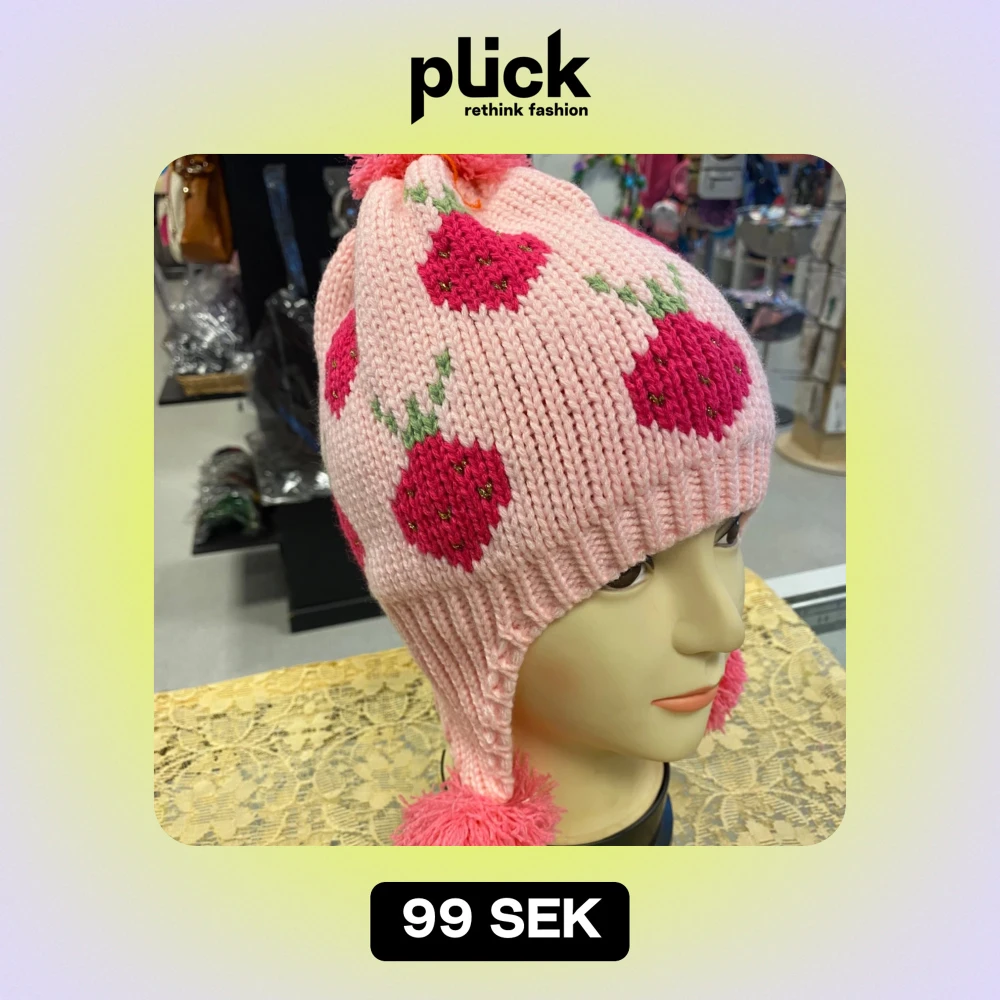 Supergullig stickad mössa med jordgubbsmönster i olika färger. Finns i rosa, röd och vit med stora tofsar på sidorna och toppen. Perfekt för att hålla sig varm och söt under vintern! Barn/ ungdomar Stlk pris 99kr/st