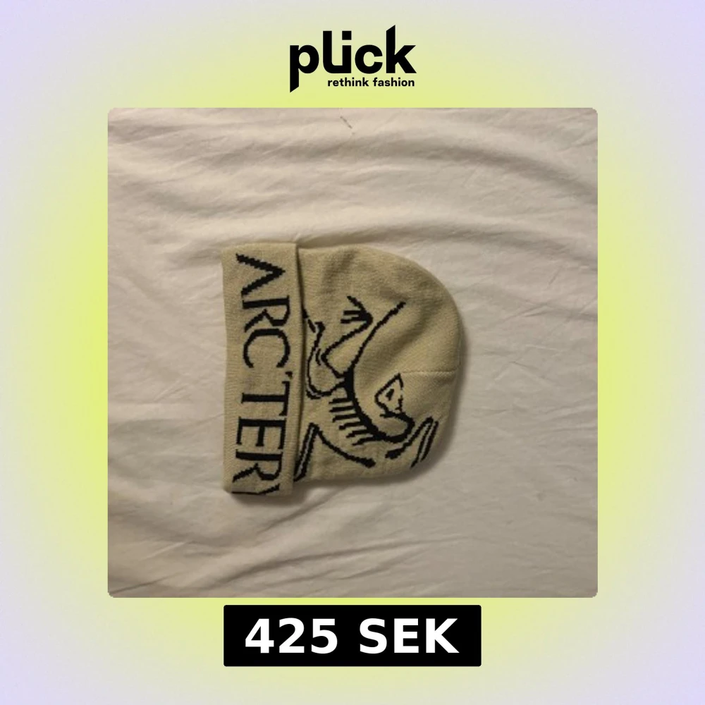 Säljer en beige mössa från Arc'teryx med svart logotyp och coolt fossilmotiv på framsidan. Mössan är stickad och har en uppvikt kant med tydlig text. Perfekt för dig som gillar friluftsliv och vill ha en stilren look.