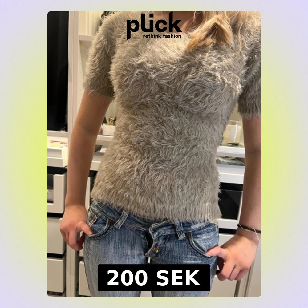 Säljer en beige fluffig topp med korta ärmar och rund hals.