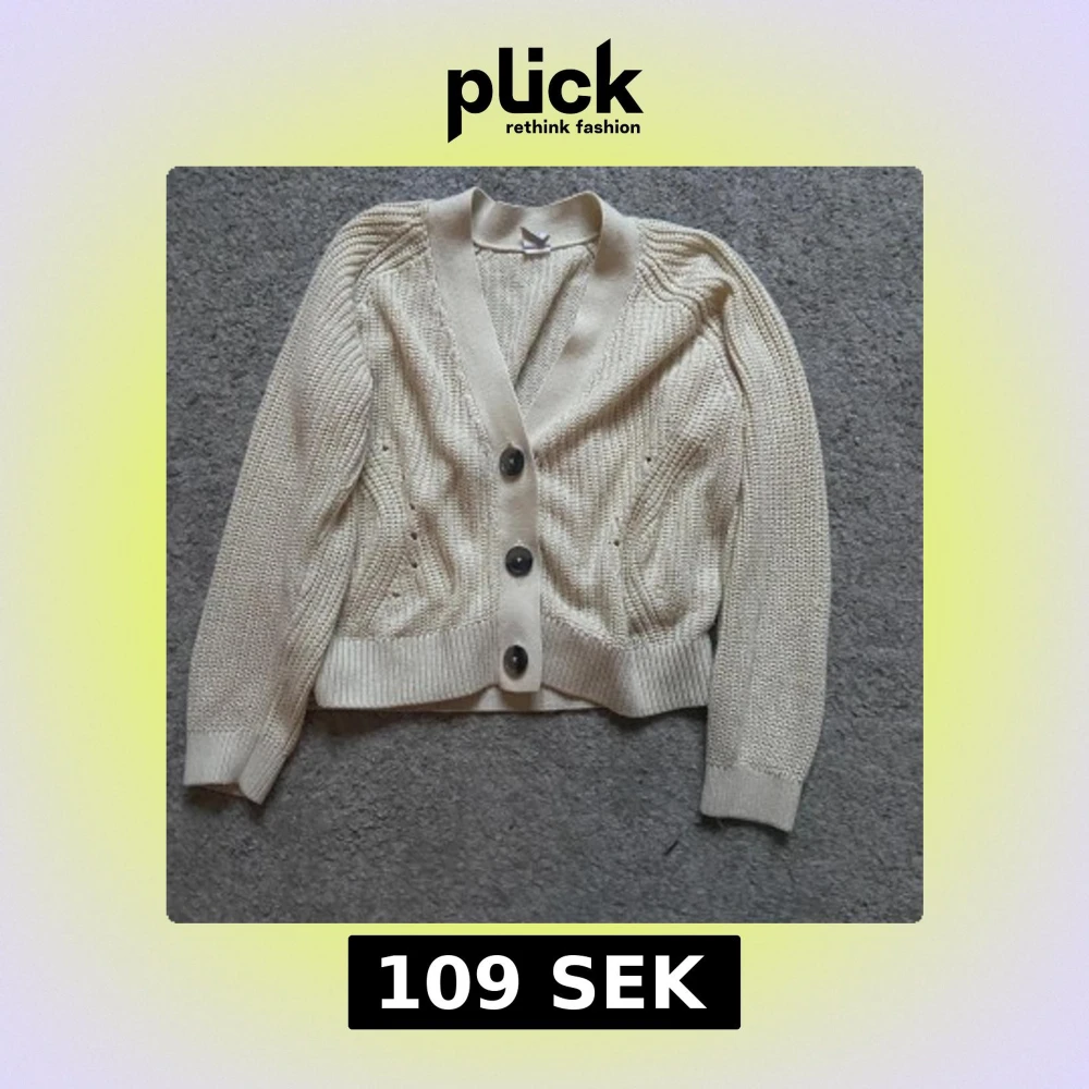 Trendig beige stickad kofta, som är perfekt till våren! Skulle säga att den passar storlek xxs!
