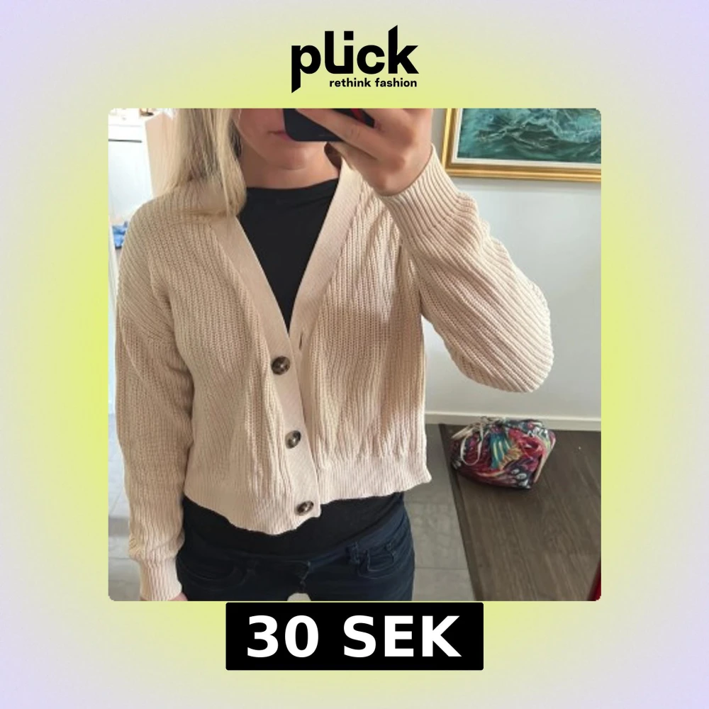 Snygg beige kofta från Selected Femme i stickad bomull. Modellen är croppad med v-ringning och stora knappar framtill. Perfekt att slänga över en t-shirt eller linne. Långärmad och med ribbade muddar för en chill vibe.