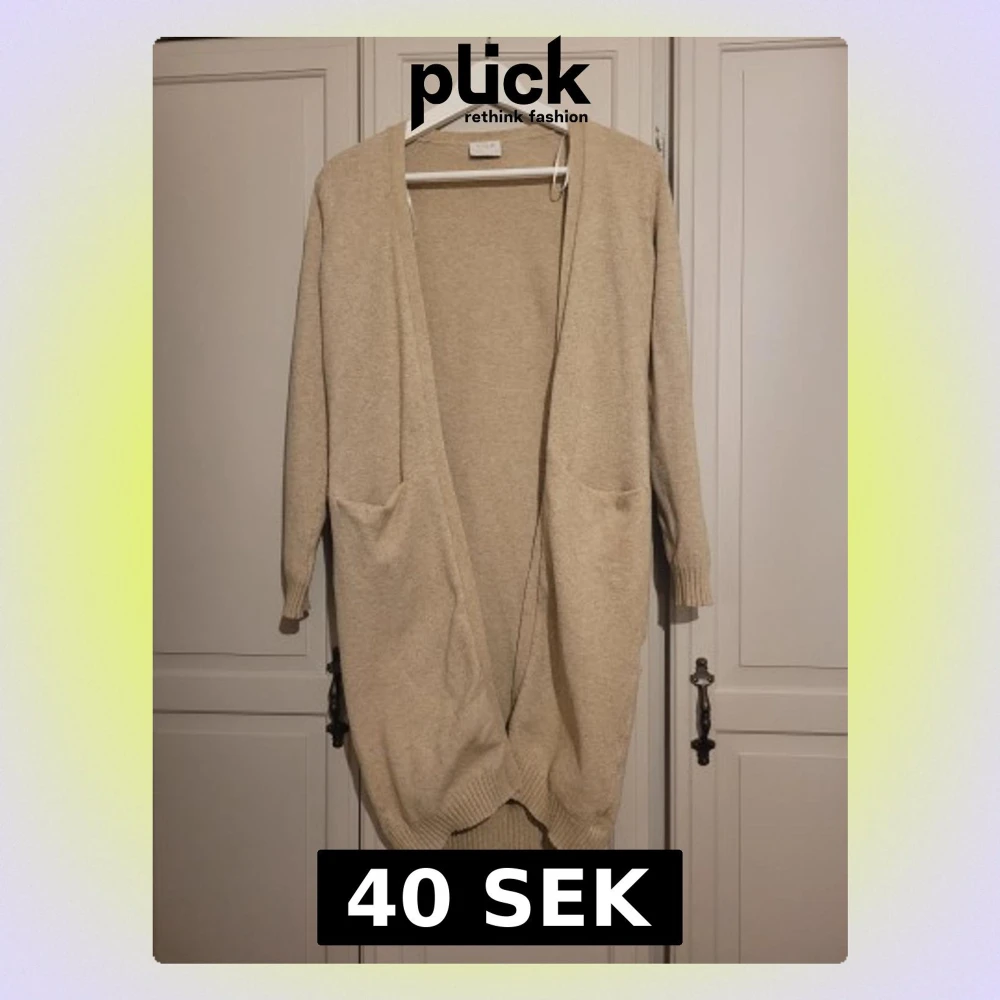 Lång, öppen beige kofta från Vila i storlek XS. Koftan har två stora fickor framtill, ribbade muddar vid ärmslut och nederkant samt en loose passform. Perfekt för lager-på-lager och chill vibes.