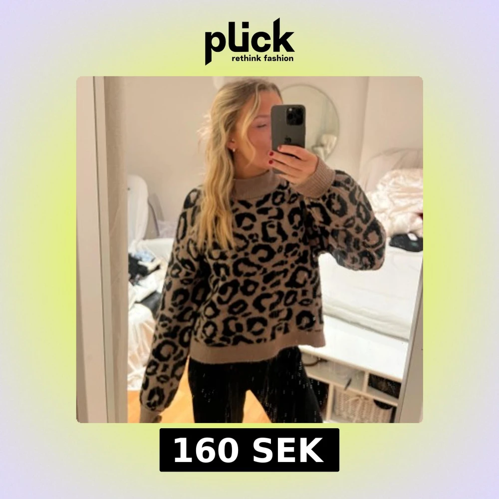 Säljer en snygg beige stickad tröja med leopardmönster. Tröjan har långa ärmar och ribbade muddar vid ärmslut och nederkant. 🐆✨