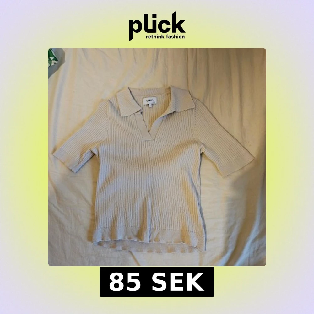 Säljer en beige ribbad topp från ONLY med krage och v-ringning. Toppen har korta ärmar och är tillverkad i ett mjukt stickat material som ger en skön känsla. Perfekt för dig som gillar en stilren och enkel look.