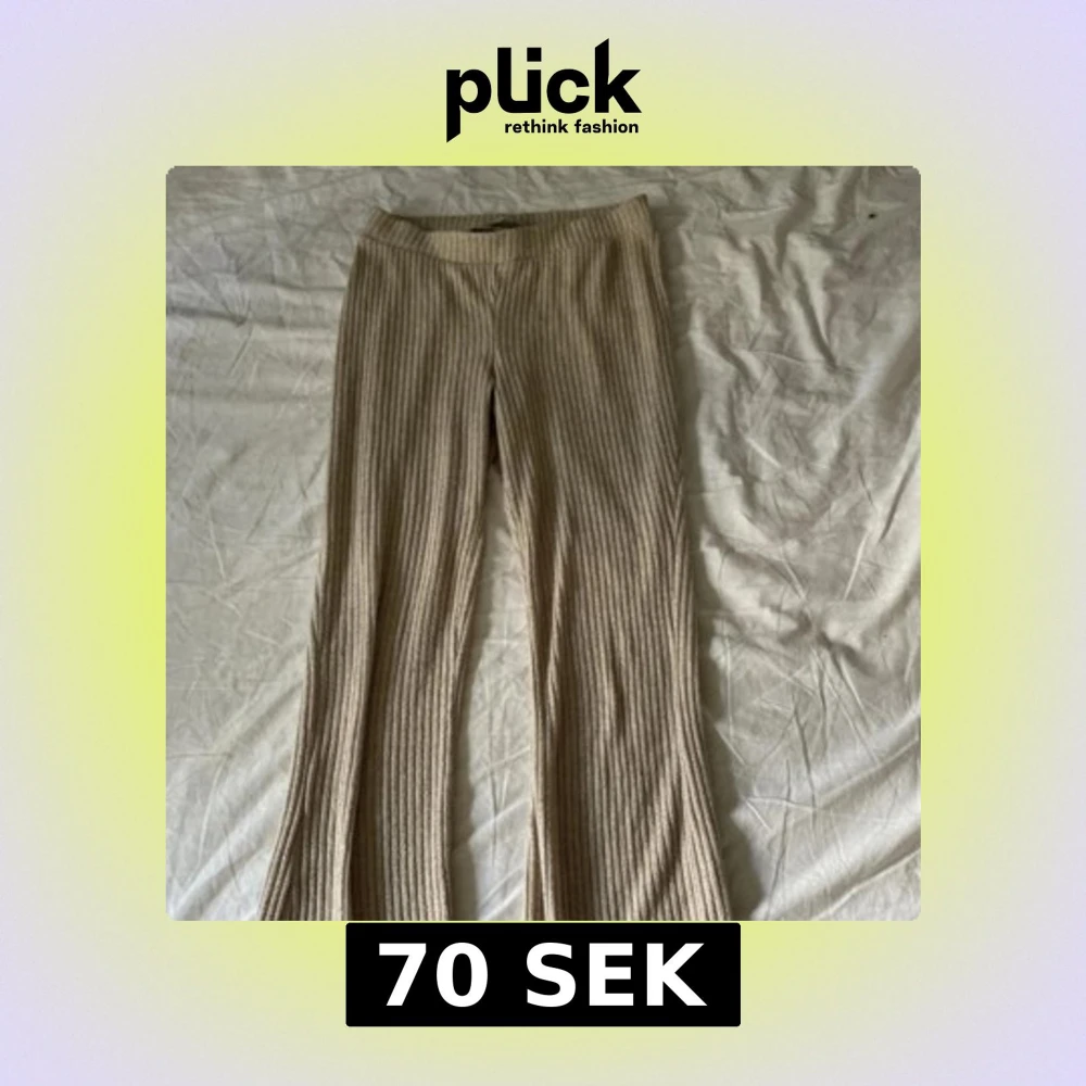 Säljer ett par beige ribbade byxor med breda ben och skön passform. Byxorna har en mjuk, stickad känsla och är perfekta för en chill och trendig look. De är höga i midjan och har en snygg, avslappnad vibe.