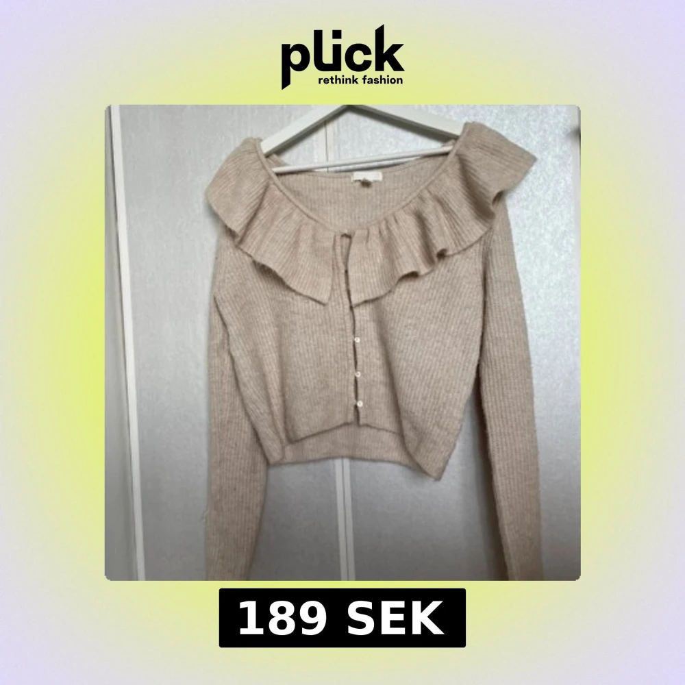 Säljer en söt beige stickad kofta från H&M med volangdetalj runt halsen och knappar framtill. Perfekt för en mysig och stilren look. Koftan har långa ärmar och en ribbad struktur.