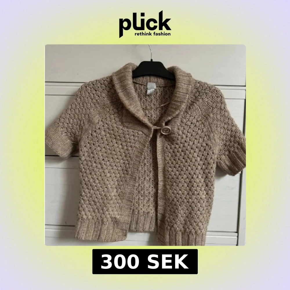 Säljer en mysig beige stickad kofta från H&M med korta ärmar och en stor knapp framtill. Perfekt för lager-på-lager under kyliga dagar. Koftan har en fin struktur och ribbade kanter.