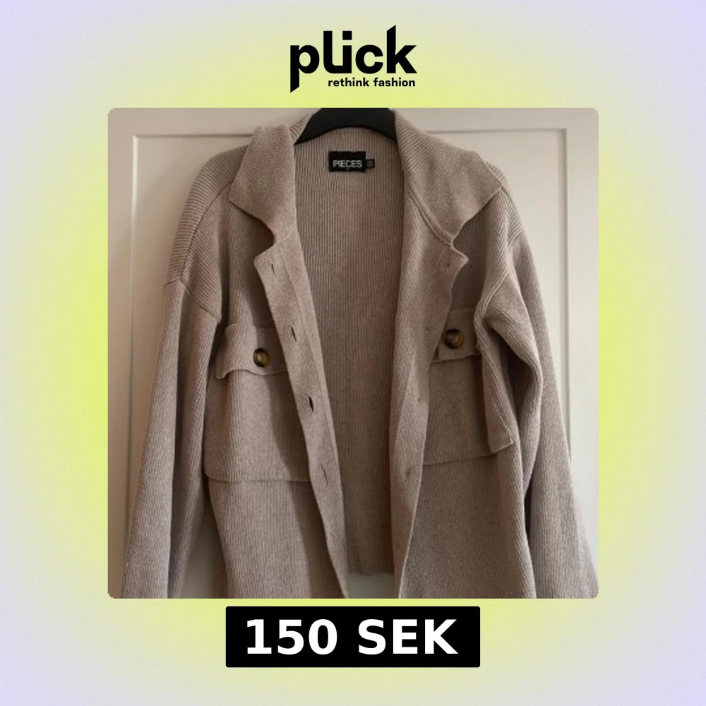 Säljer en beige stickad kofta från Pieces i storlek M. Koftan har ribbad struktur, stora fickor framtill med knappar och en avslappnad passform, storlek M men jag tycker att den är större än så