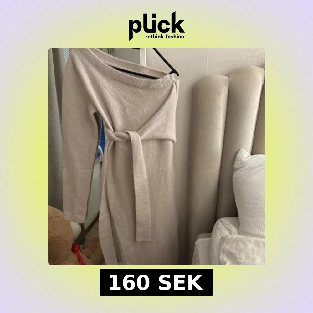 Supermysig beige stickad långklänning från NA-KD i storlek XS. Klänningen har offshoulder-design, långa ärmar och ett matchande bälte i midjan som knyts, även slits längst ner🤍