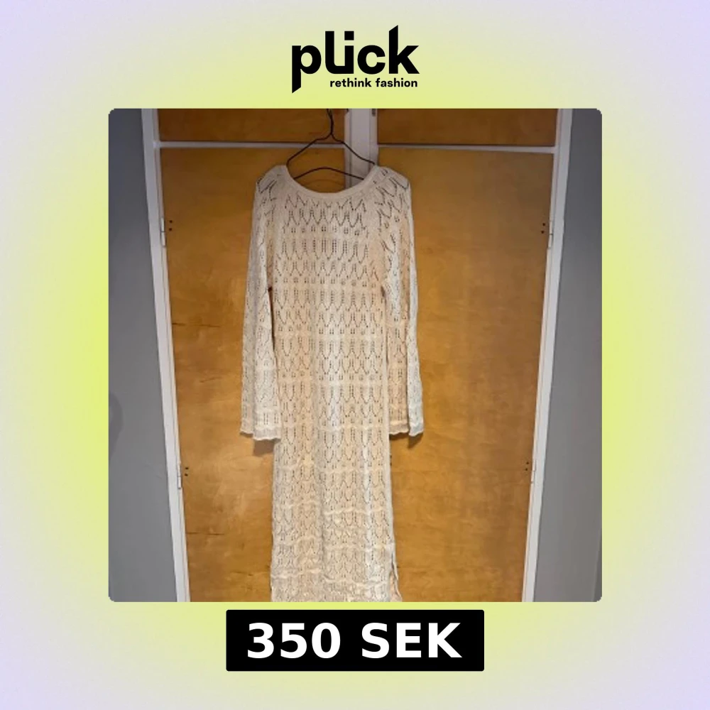Säljer en beige stickad långklänning med snyggt hålmönster och rund hals. Klänningen har långa ärmar och en fin knytning i nacken som ger extra detalj. Perfekt för dig som gillar boho-vibe och vill ha något unikt i garderoben.