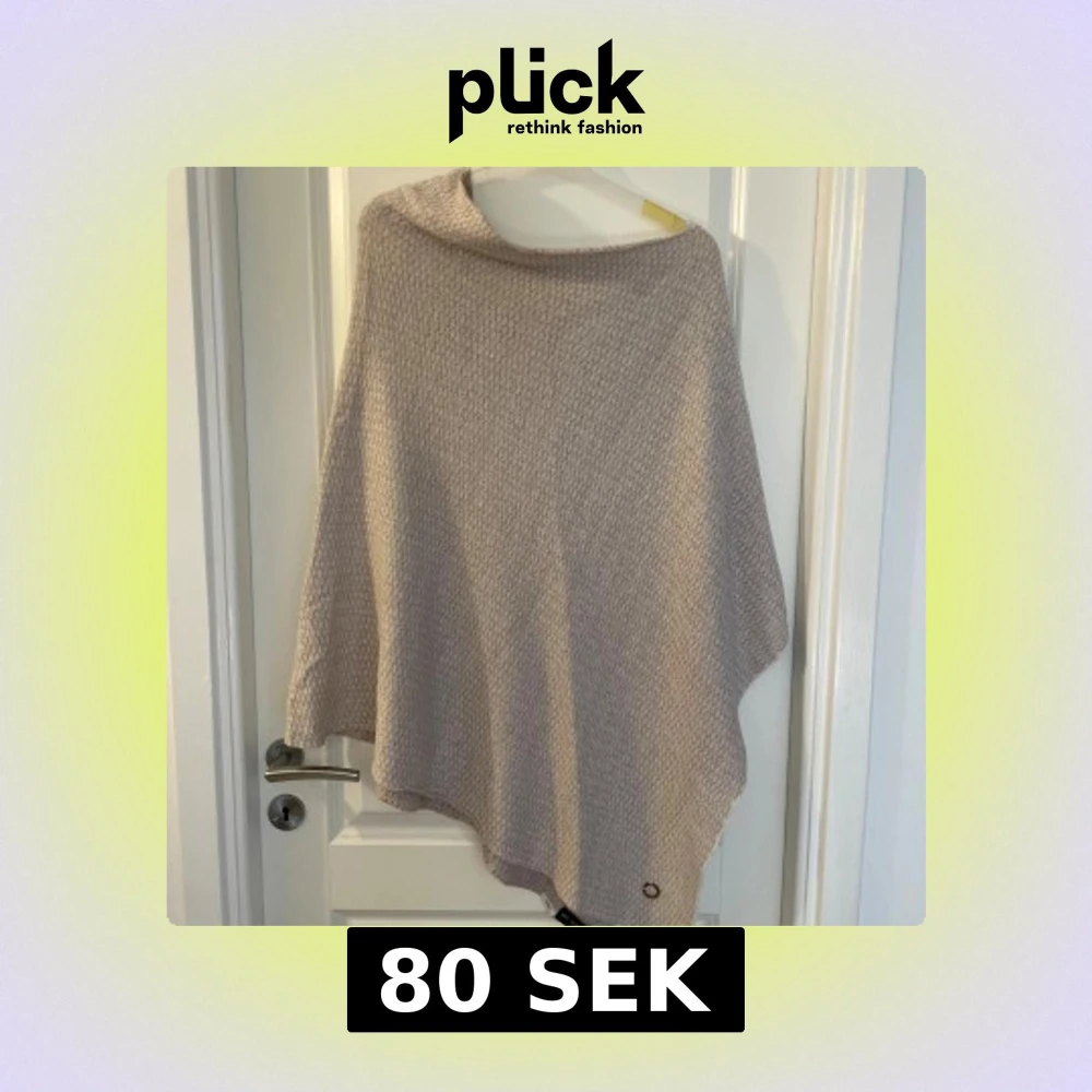 Supermysig beige stickad poncho från Stockh LM. Den har en mjuk struktur och är perfekt att slänga över sig när det är kyligt. Ponchon har en lätt asymmetrisk form och är enkel att styla till olika outfits.