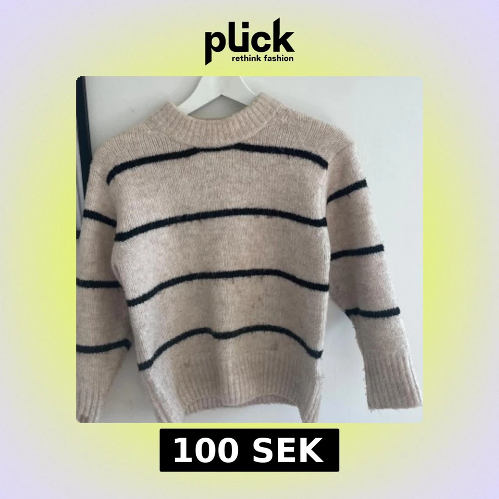 Beige stickad tröja med svarta horisontella ränder och ribbad hög hals. Tröjan har lång ärm och breda muddar vid ärmslut och nederkant. Perfekt för lager-på-lager och chill höst- eller vinterstil.använd ett fåtal gånger,som ny