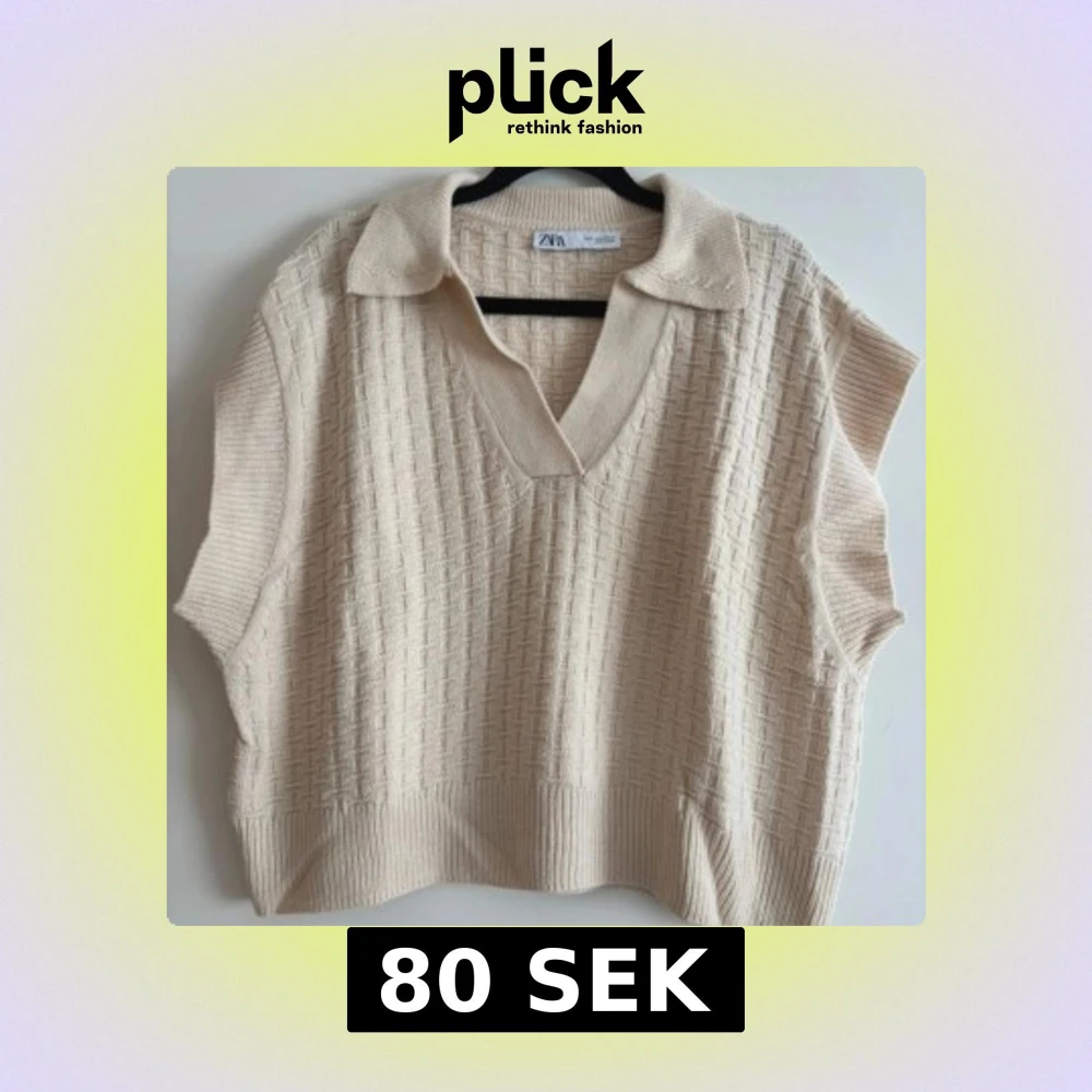 Beige stickad väst topp från Zara med krage och v-ringning. Toppen har ett diskret rutmönster i strukturen och är ärmlös med breda ribbade kanter. Perfekt för lager-på-lager och ger en chill men ändå stilren vibe.