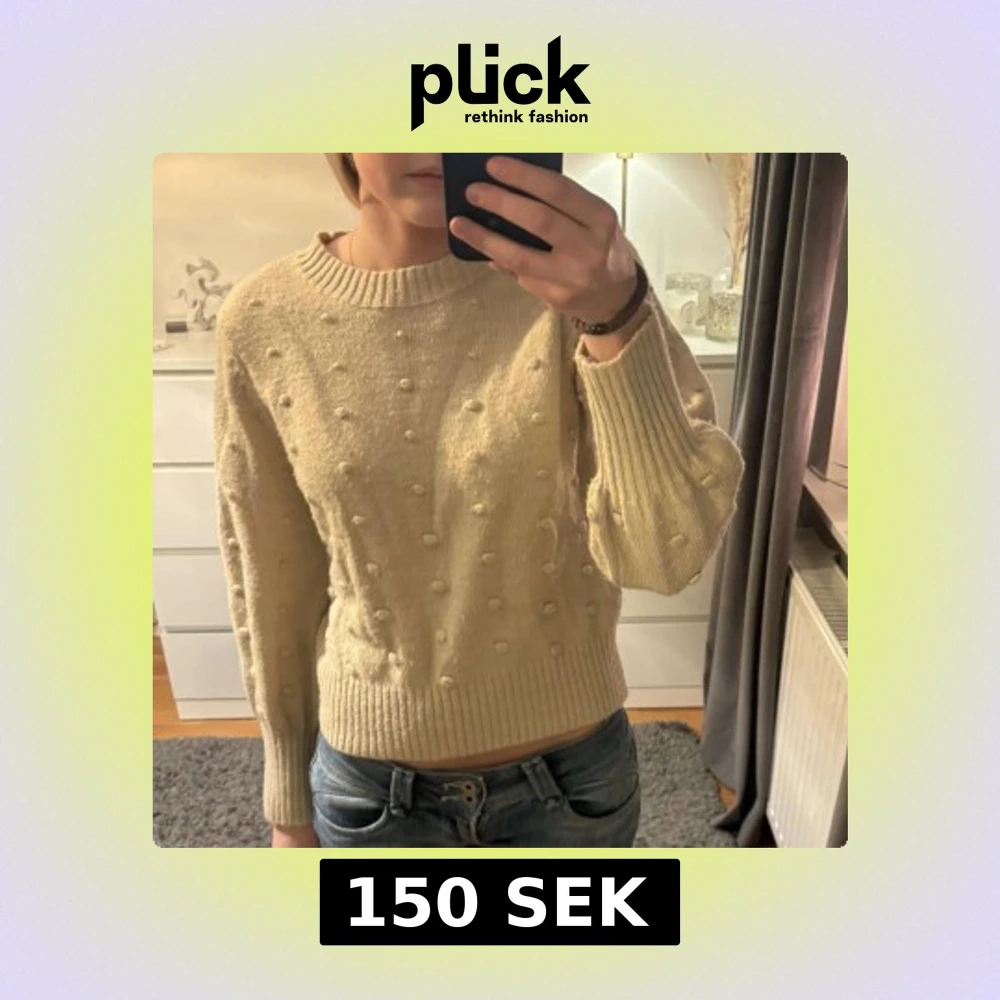 Säljer en beige stickad tröja från Object med ett unikt prickigt mönster. Tröjan har långa ärmar och en ribbad kant vid halsen och ärmsluten. Perfekt för kyliga dagar!