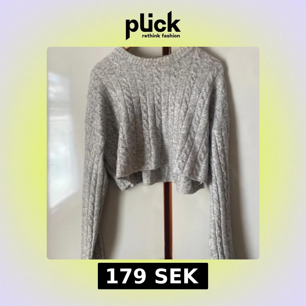 Säljer en grå croppad stickad tröja från Bershka med kabelstickat mönster. Tröjan har långa ärmar och rund halsringning, perfekt för lager-på-lager-stil. Endast använd 2 gånger