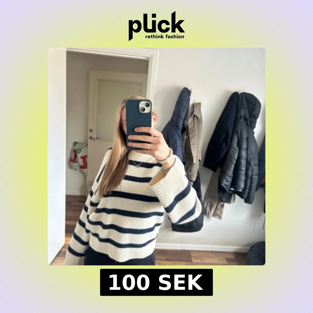 Säljer en vit stickad tröja med marinblå ränder. Tröjan är från BikBoK och är i storlek XS men är lite större i storleken
