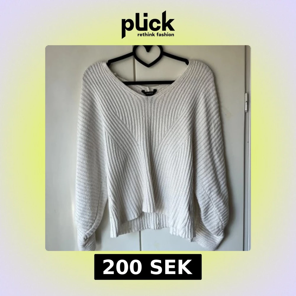 Säljer en vit stickad tröja från Lindex med v-ringad hals och ribbad struktur. Tröjan har tre kvarts ärm och en lite lösare passform. Superenkel att matcha till olika outfits! Har bara använt den 2 gånger.