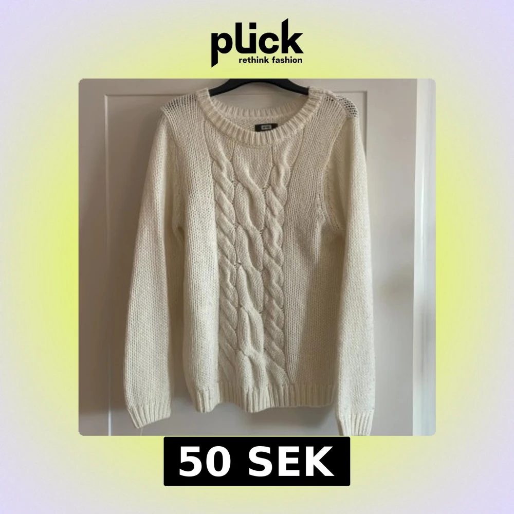 Säljer en vit stickad tröja från Bik Bok i storlek M. Tröjan har grov kabelstickning framtill, rund halsringning och långa ärmar. Perfekt för lager-på-lager och chill höst- och vinterstil.