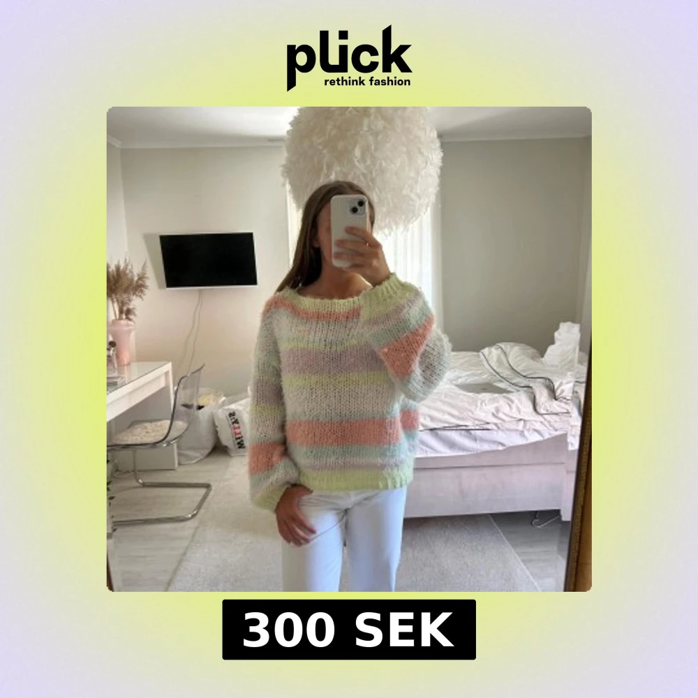 Supermysig stickad tröja med breda pastellfärgade ränder i ljusgrön, rosa, lila och vit. Tröjan har en loose passform och långa ärmar, perfekt för att mysa runt i. Den är fluffig och har en rund halsringning.