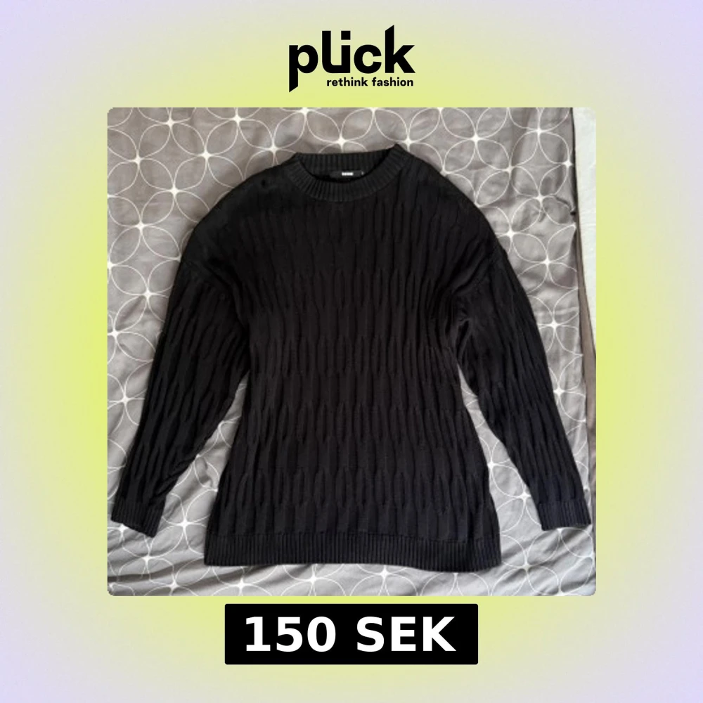 Säljer en svart stickad tröja med ett diskret mönster. Tröjan har långa ärmar och en bekväm (lite oversized) passform. Strlk S men passar M Org pris 400kr
