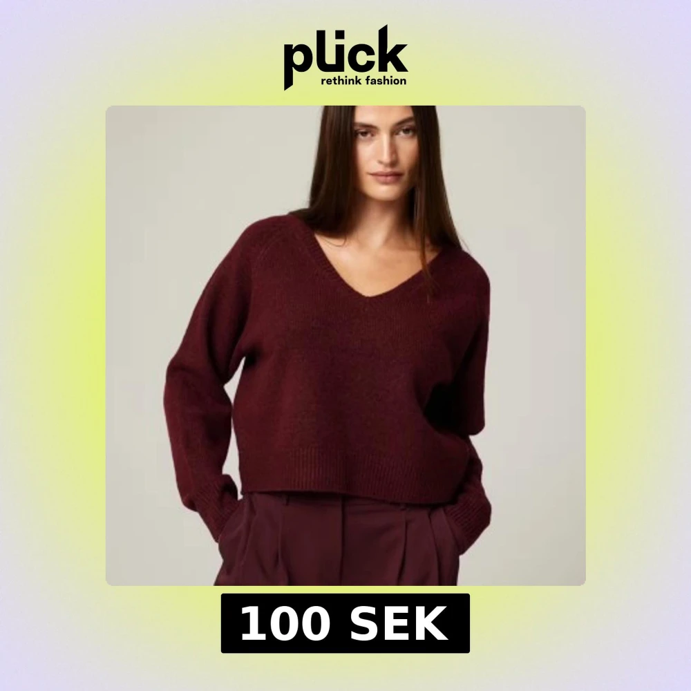 Mysig vinröd stickad tröja med v-ringning och avslappnad passform. Tröjan har långa ärmar och ribbade muddar vid ärmslut och nederkant. Perfekt för lager-på-lager under kyliga dagar.