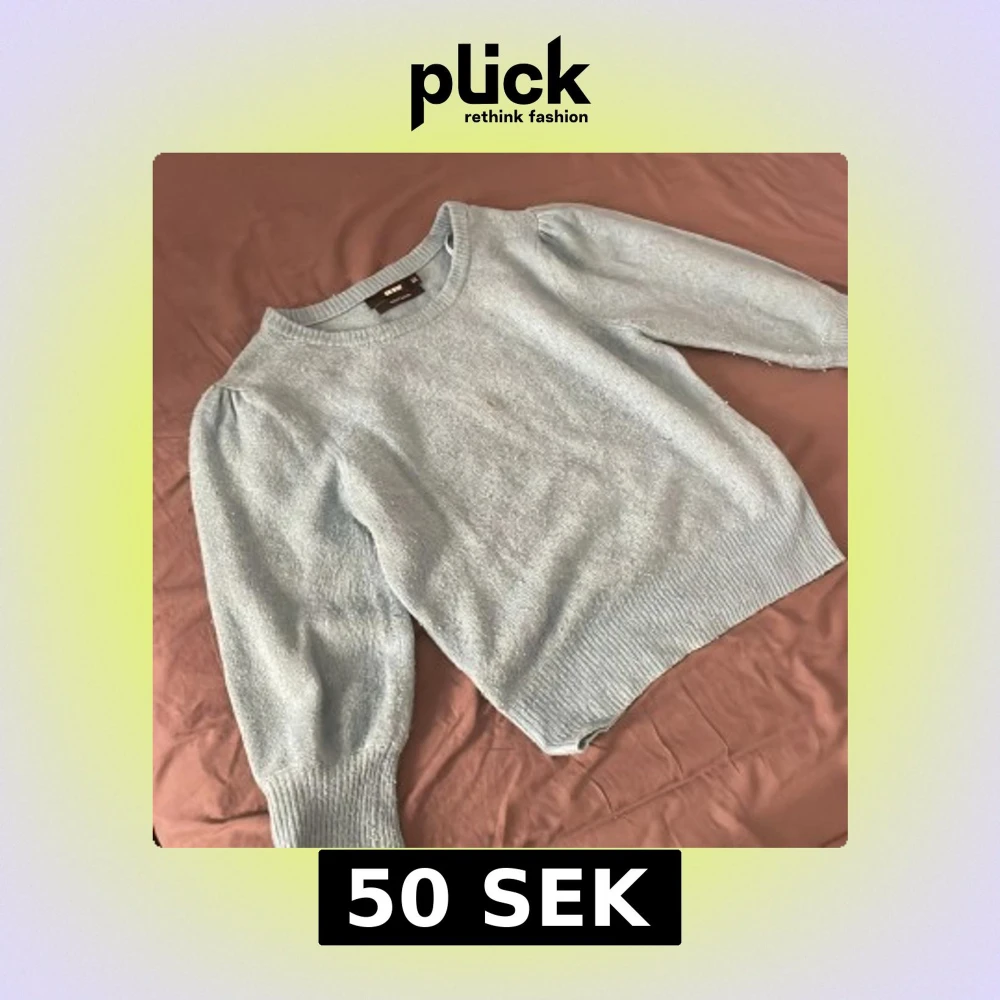 Supermjuk ljusblå stickad tröja från Bik Bok i ullblandning. Tröjan har rund hals, långa ärmar med lätt puff och breda ribbade muddar. Perfekt för lager-på-lager och chill dagar. Snygg till både jeans och kjol.