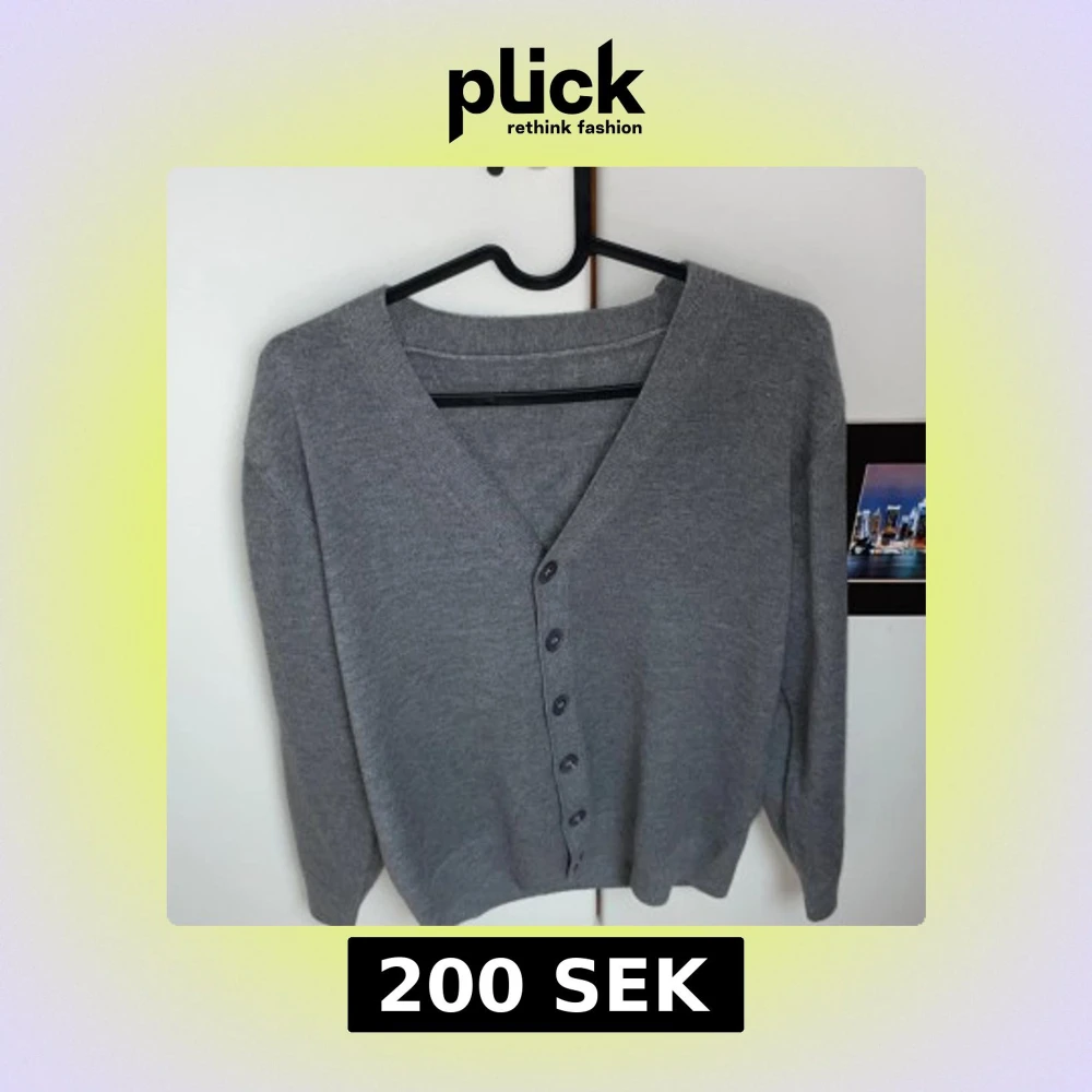 En stilren grå kofta med v-ringning och knäppning framtill. Koftan har långa ärmar och är gjord i ett mjukt, stickat material som passar perfekt för lager på lager. Det är en manlig tröja men den passar verkligen både könen