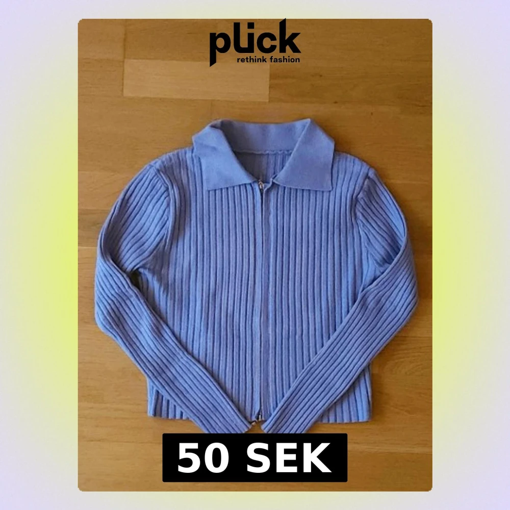 Blå ribbad kofta med dragkedja framtill och klassisk krage. Tröjan har lång ärm och är gjord i ett mjukt stickat material som känns både trendigt och bekvämt. Perfekt för dig som gillar en clean och stilren look.
