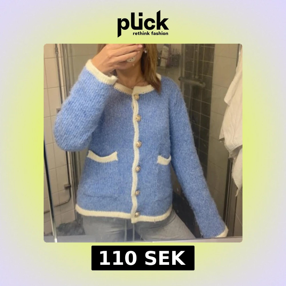 Mysig blå kofta med vita kanter och knappar framtill. Koftan har två fickor och är stickad i ett fluffigt material som känns skönt mot huden. Perfekt för kyliga dagar och har långärmad passform med normal passning.