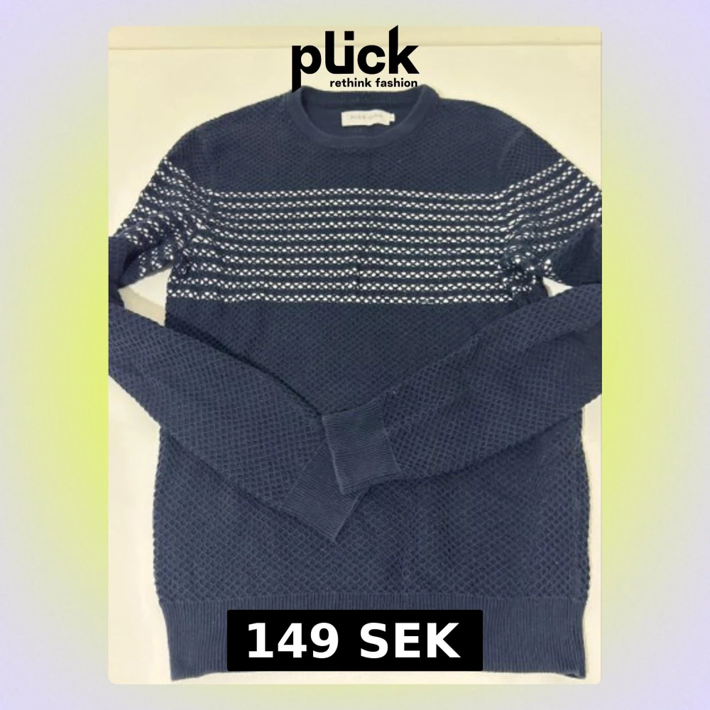 Mörkblå stickad tröja från Pier One i storlek S. Tröjan har vita horisontella ränder över bröstet och ett snyggt strukturmönster. Rund halsringning och ribbade muddar vid ärmslut och nederkant. Perfekt för dig som gillar klassisk men modern stil.